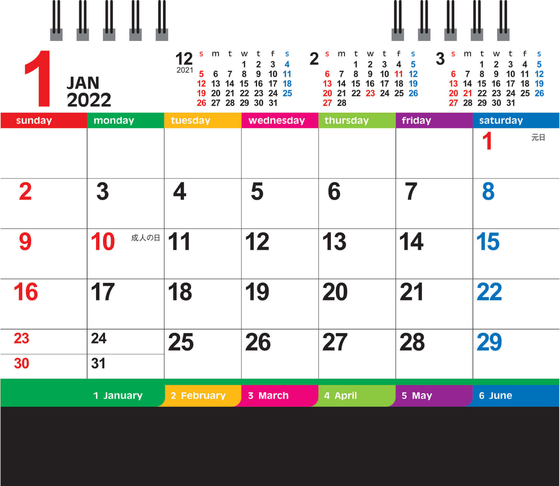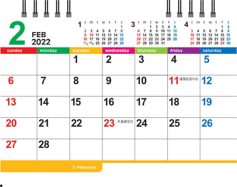 前月1ヶ月、後月2ヶ月を乗っているので、スケジュール管理に便利なカレンダーです。オフィスワーク、テレワークをしている方は机の横に置いておきたいカレンダーだと思います。