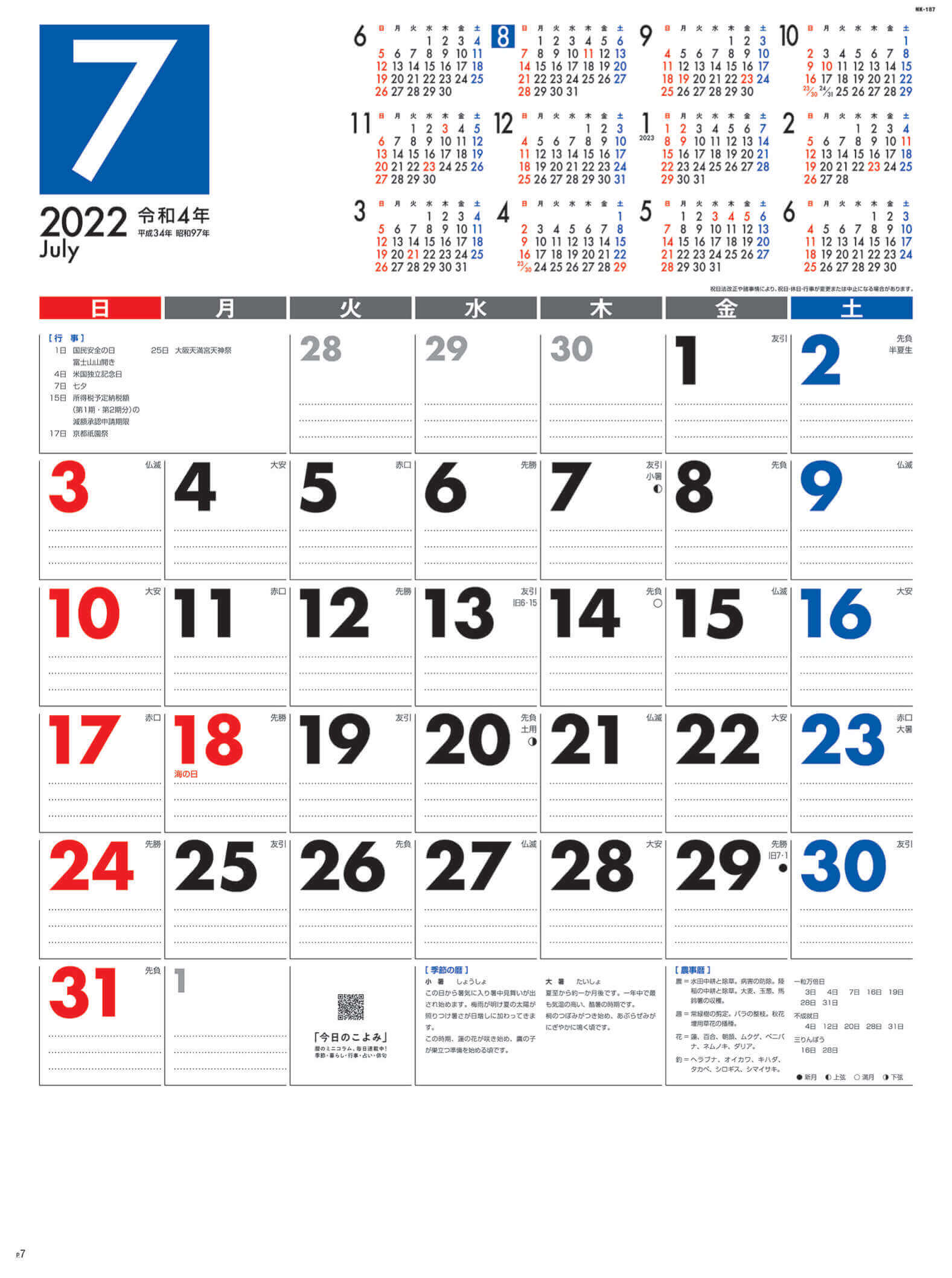 スケジュール管理に便利な年間カレンダー付き。メモ欄がたっぷり書ける使いやすい6週表示。大きく太めの文字で視力が心配な人も安心。QRコードをスマートフォンでスキャンすると本日の暦についても教えてくれます。