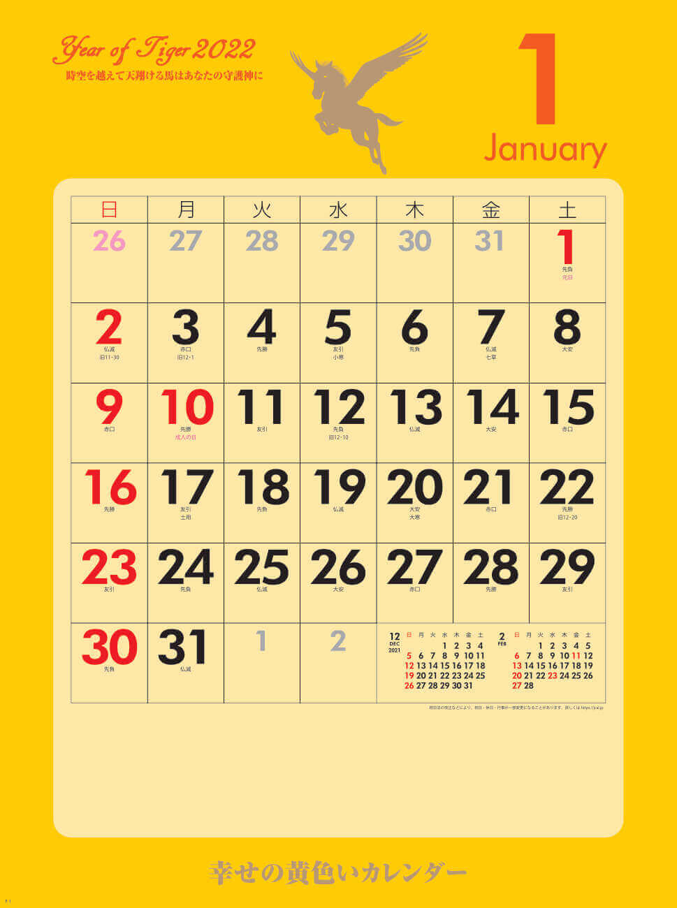 幸せの黄色が部屋を明るくし、大きなメモスペースで実用性にも優れた、販促品として最適な作品です。幸運を象徴する”天馬”が全てのページに存在します。
