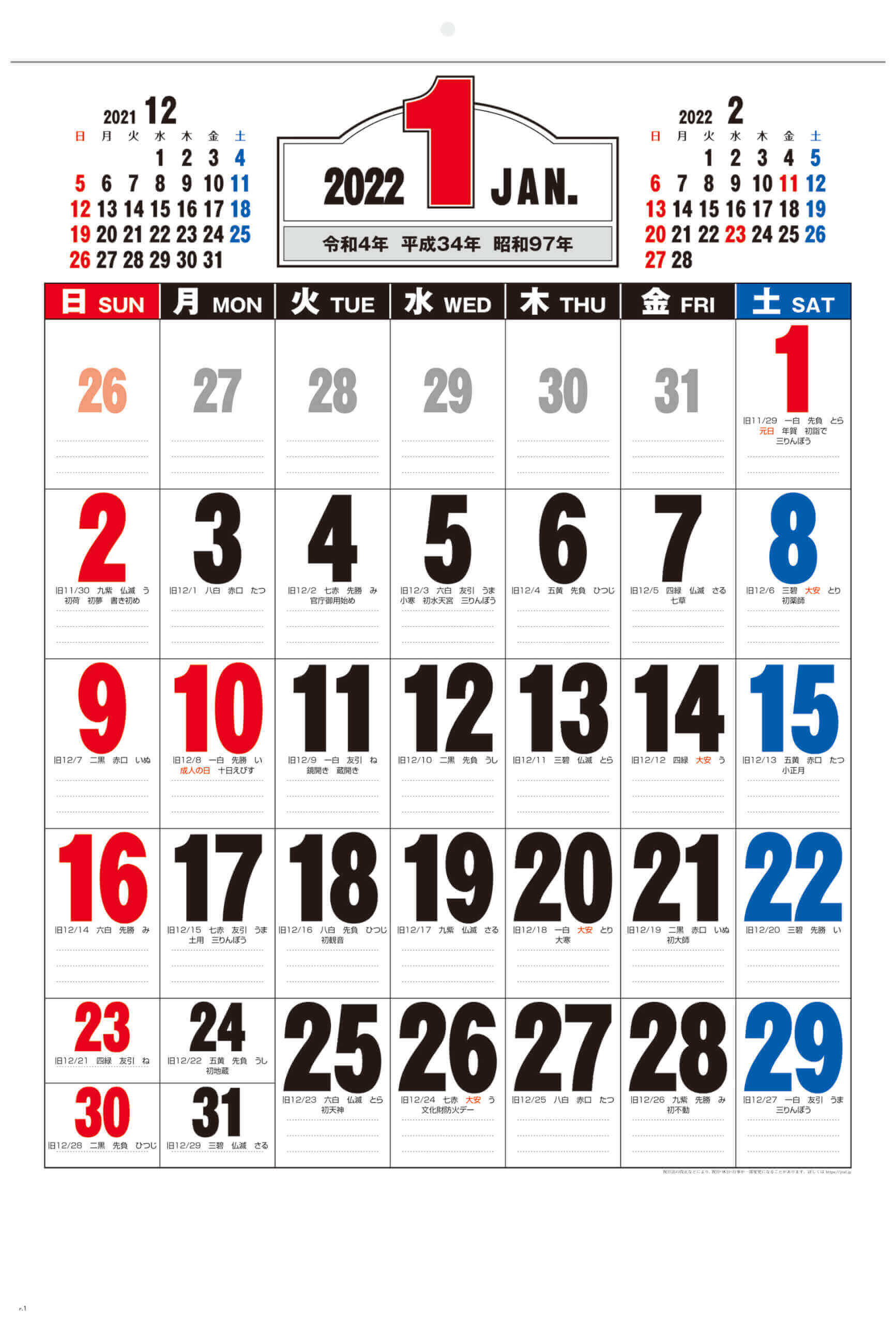 個人でのご注文はこちら YG-51 前後月3色ジャンボ文字 2022年カレンダー
