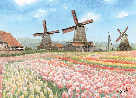 織田義郎(おだよしお = Yoshio Oda) 1940年生まれ 東京生まれ京都育ち。松下電器産業を退社後、独立しニューヨークでイラストレーション及びCIデザインを学ぶ。イラストレーターから画家へ転向後は水彩画や版画等多くの作品を発表。豊かな色彩感覚で様々な風景を描写する作風に固定ファンも多い。